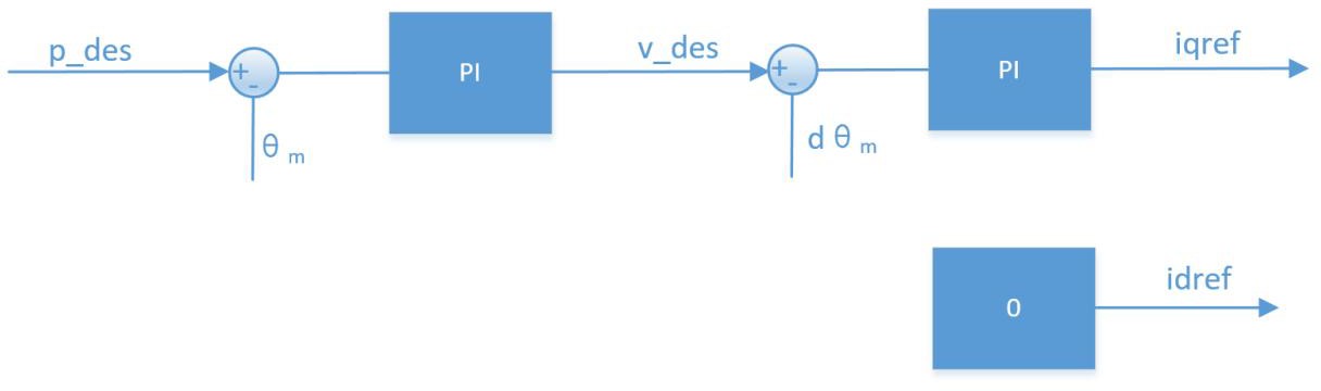 位置カスケード制御は三環連鎖制御モードであり、位置ループが最外周ループとして機能し、その出力が速度ループの指令値です。 速度ループの出力は内側電流ループの指令値として用いられ、実際の電流出力を制御します。制御ブロック図は下図の通りです:
