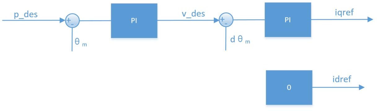 位置カスケード制御は三環連鎖制御モードであり、位置ループが最外周ループとして機能し、その出力が速度ループの指令値です。 速度ループの出力は内側電流ループの指令値として用いられ、実際の電流出力を制御します。制御ブロック図は下図の通りです: